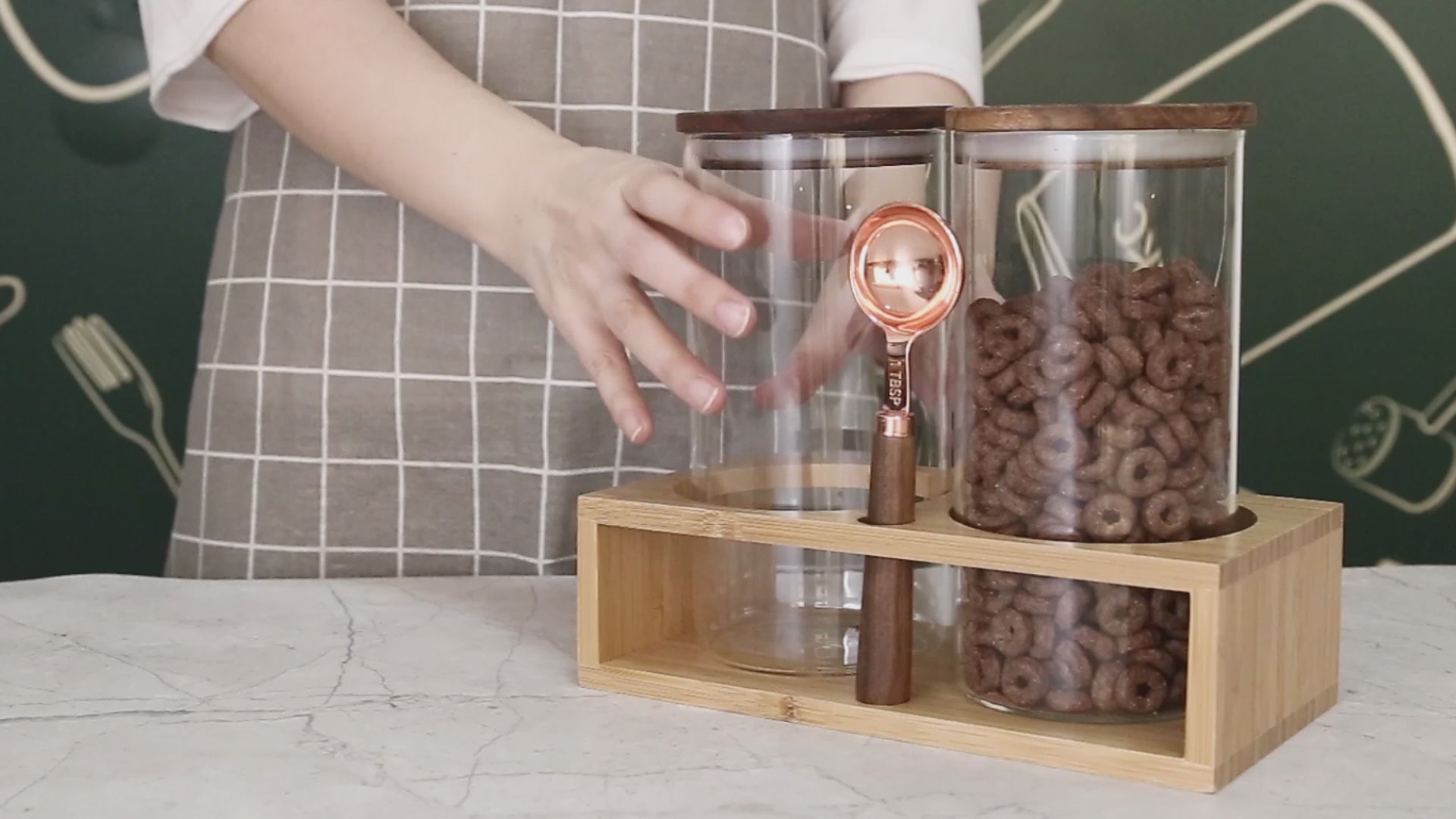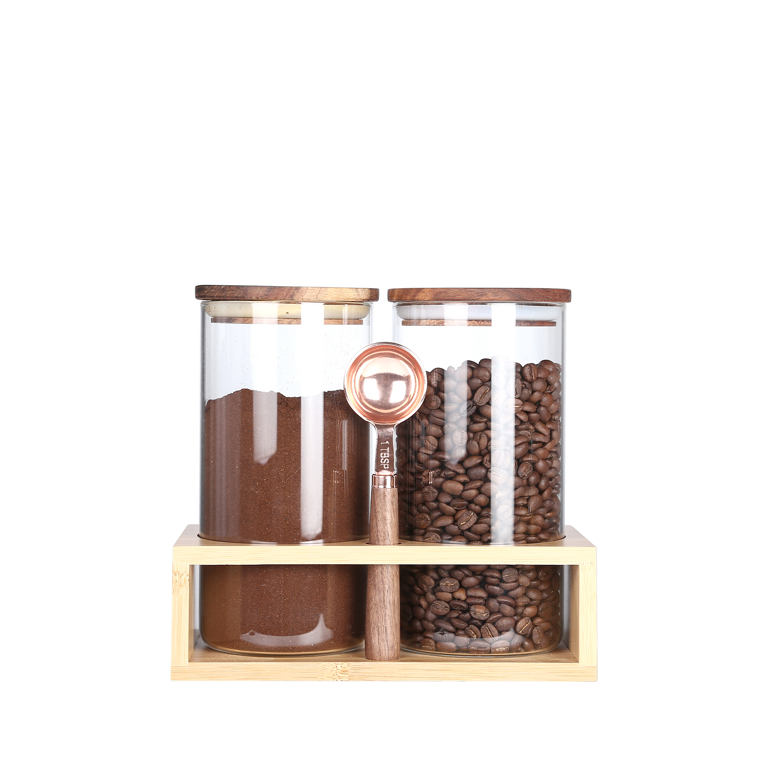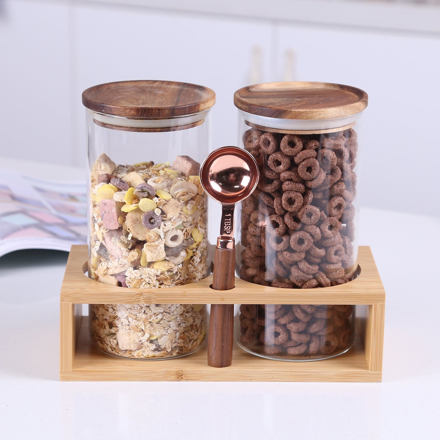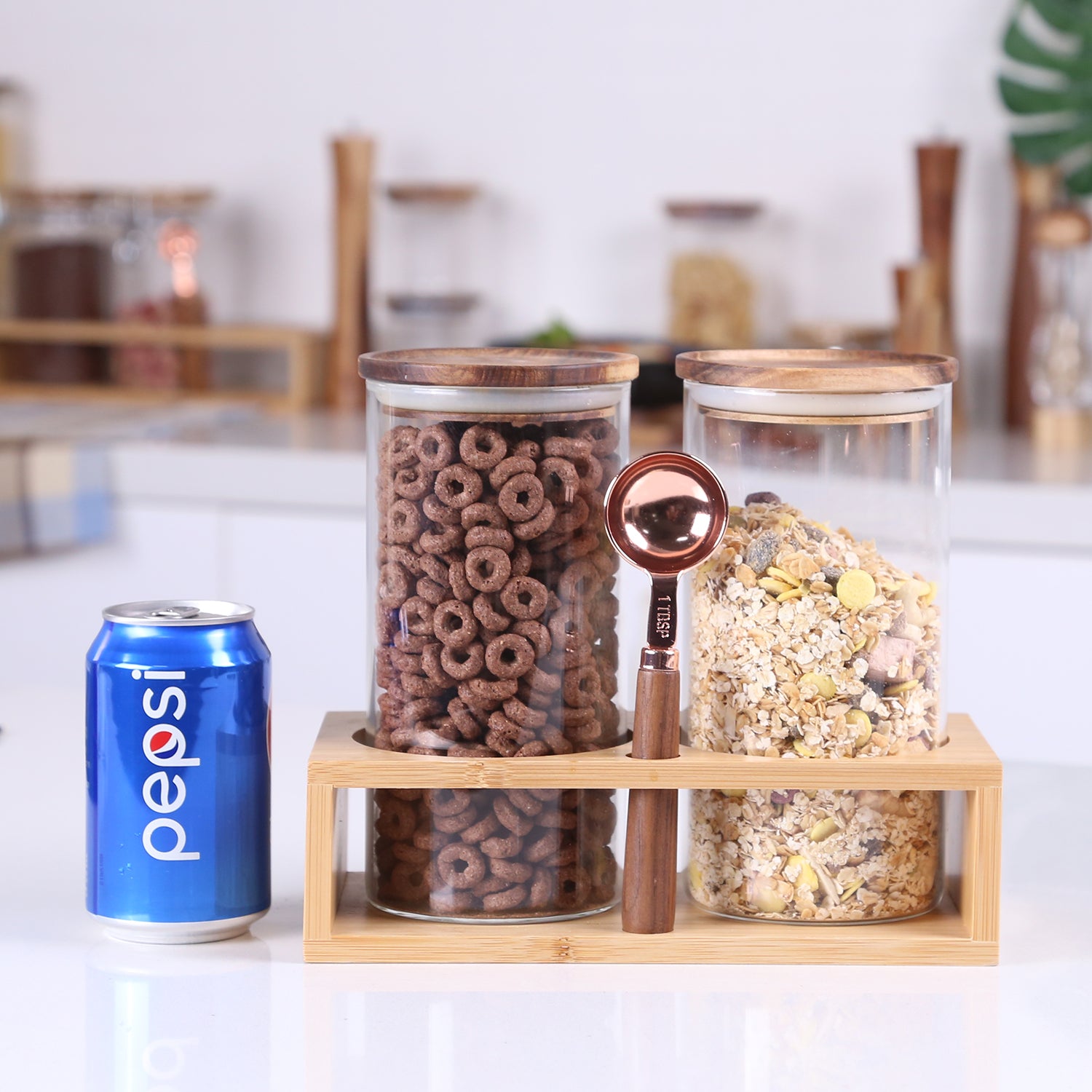 - Material : The storage jars are made from high-grade clear borosilicate glass,the airtight lids are made from natural wood, the Rack is made from natural bamboo, the spoon is made from natural wood and metal.