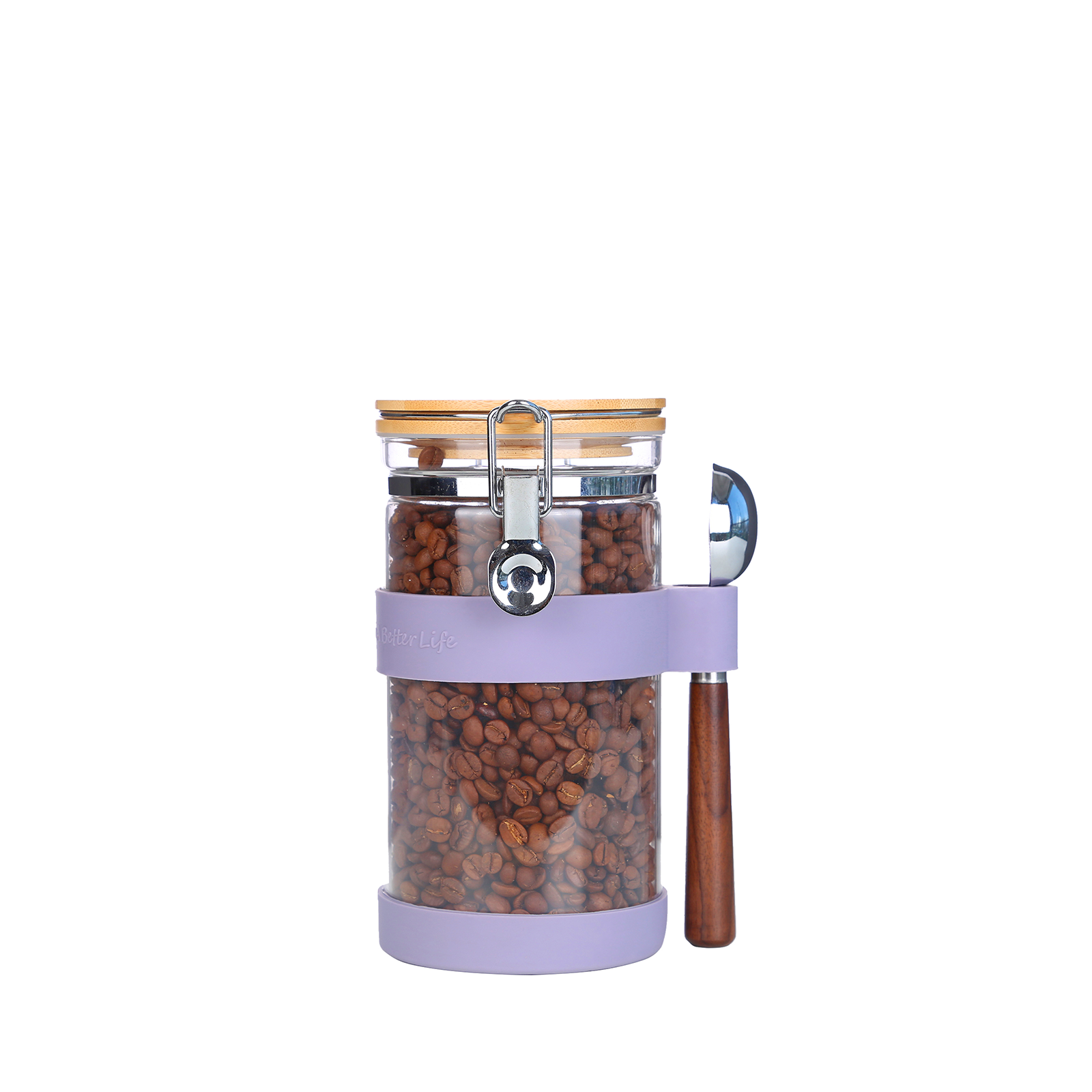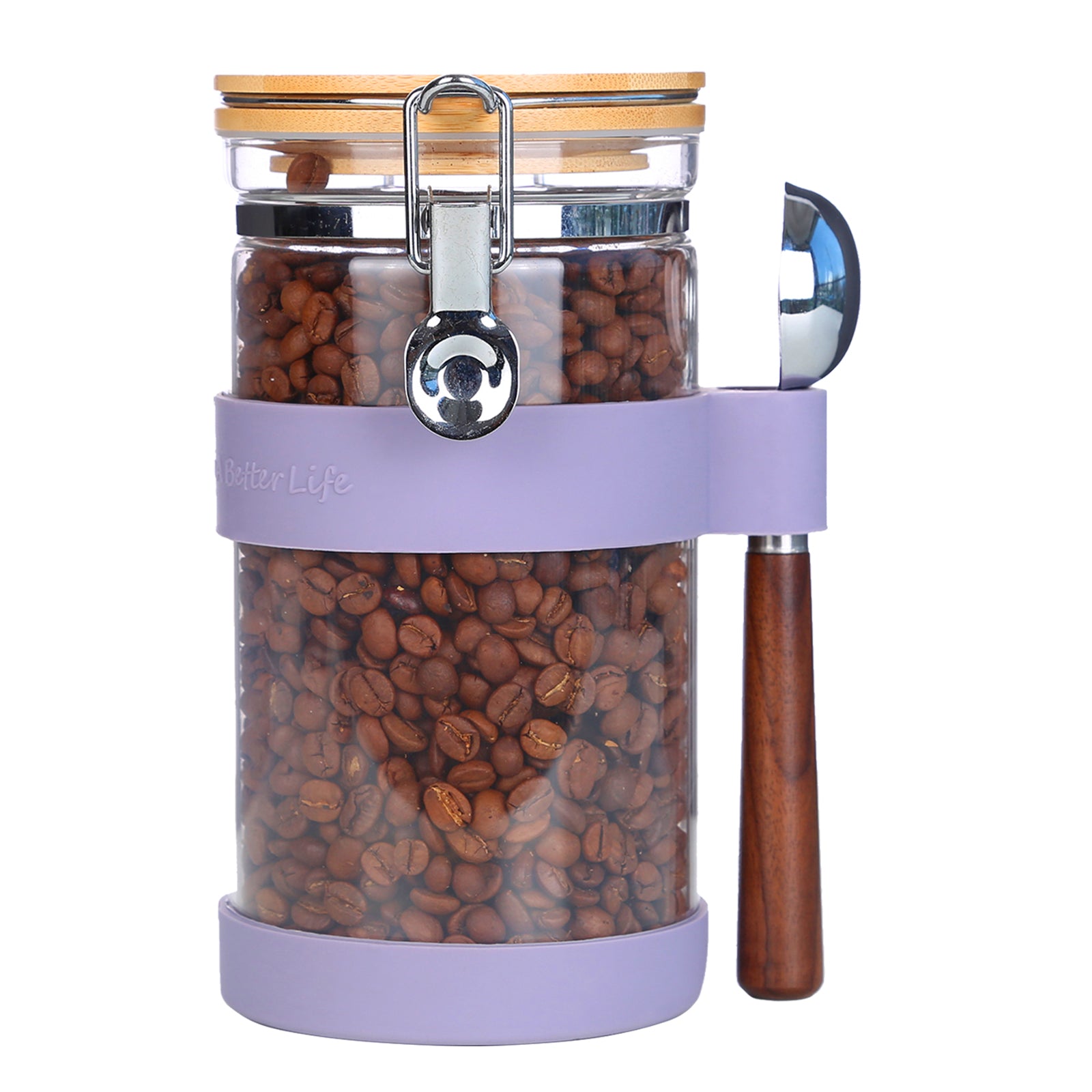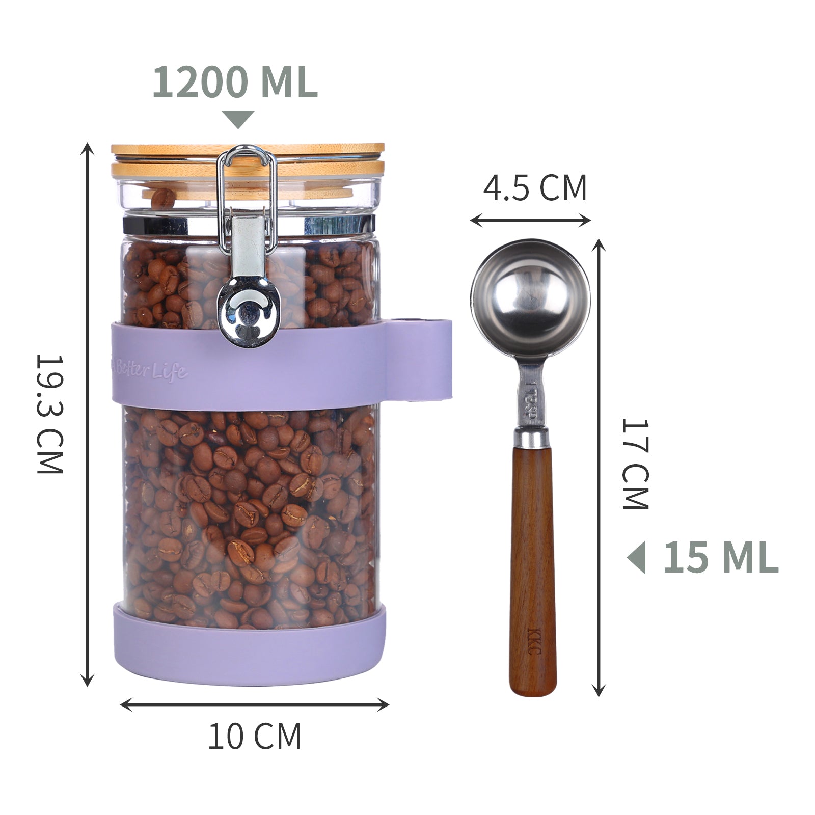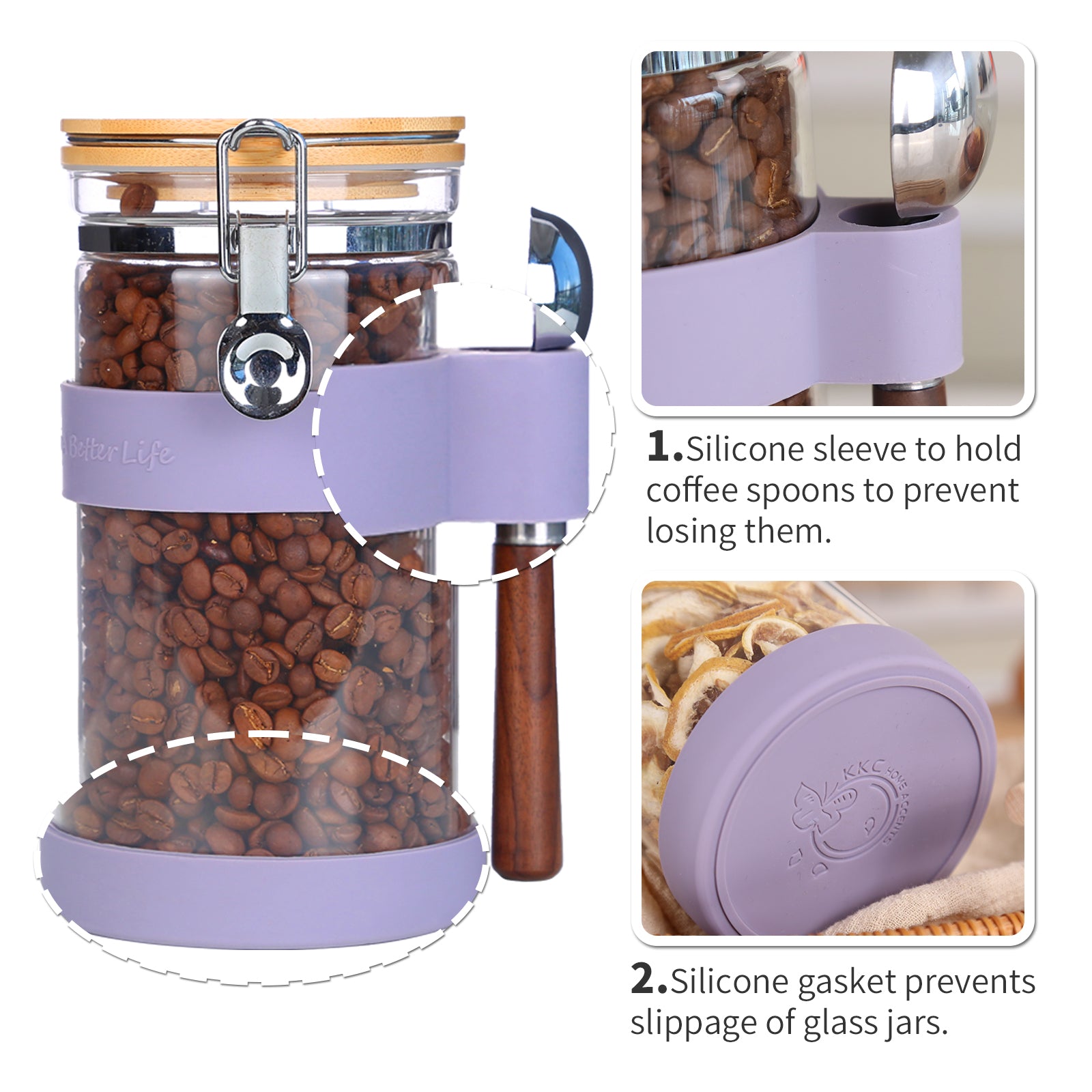 KKC Airtight Coffee Canister, Glass Coffee Bean Storage Contaienr with Silicon Scoop Holder, Non-Slip Silicon Coffee Storage Canister with Spoon for 1 lb Bean,40 Fluid-oz,Taro Purple