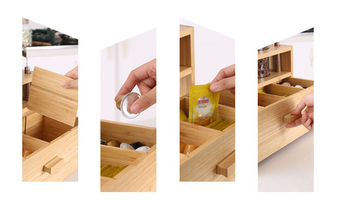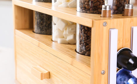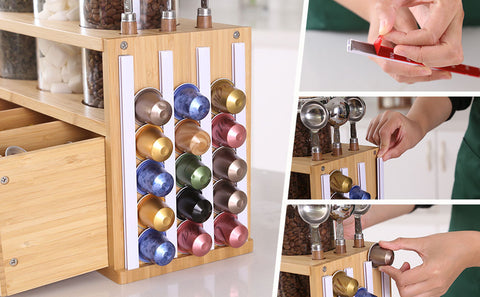 - 【Package Quantity 】: bamboo organizer (assemble) x 1 piece,glass Sealed jar x 3 piece , scoop x 3 piece , coffee pods holder strips x 8 piece.
