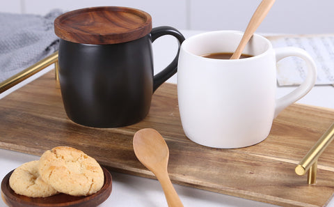 - ☕【Package Quantity】:Beautifully packaged,perfect gift for anyone. Black cup x 1 pcs, white cup x 1 pcs, acacia wood lid x 2 pcs, wooden spoon x 2 pcs.