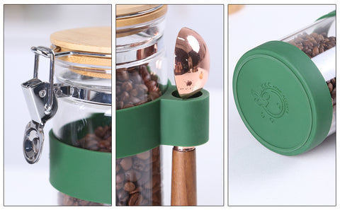 - 【Packing list】: 1 piece of glass Jar,1 piece of scoop,1 Set the silicone sleeve (scoop holder and non-slip mat).