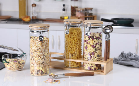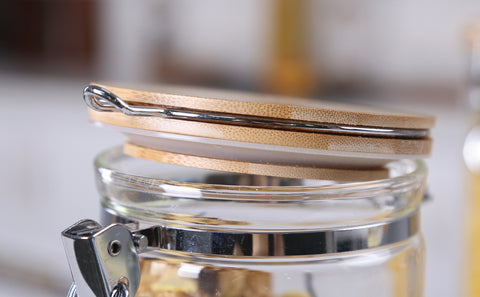 - 【Airtight seal jar】: the airtight bamboo lid has a locking clamp and silicone sealed ring keeps moisture away from the dry goods inside,so it is perfect for storing ground coffee,nuts,loose leaf tea,brown sugar,flour,pasta,cereal etc. fresh.Keep your dry food fresher, longer.