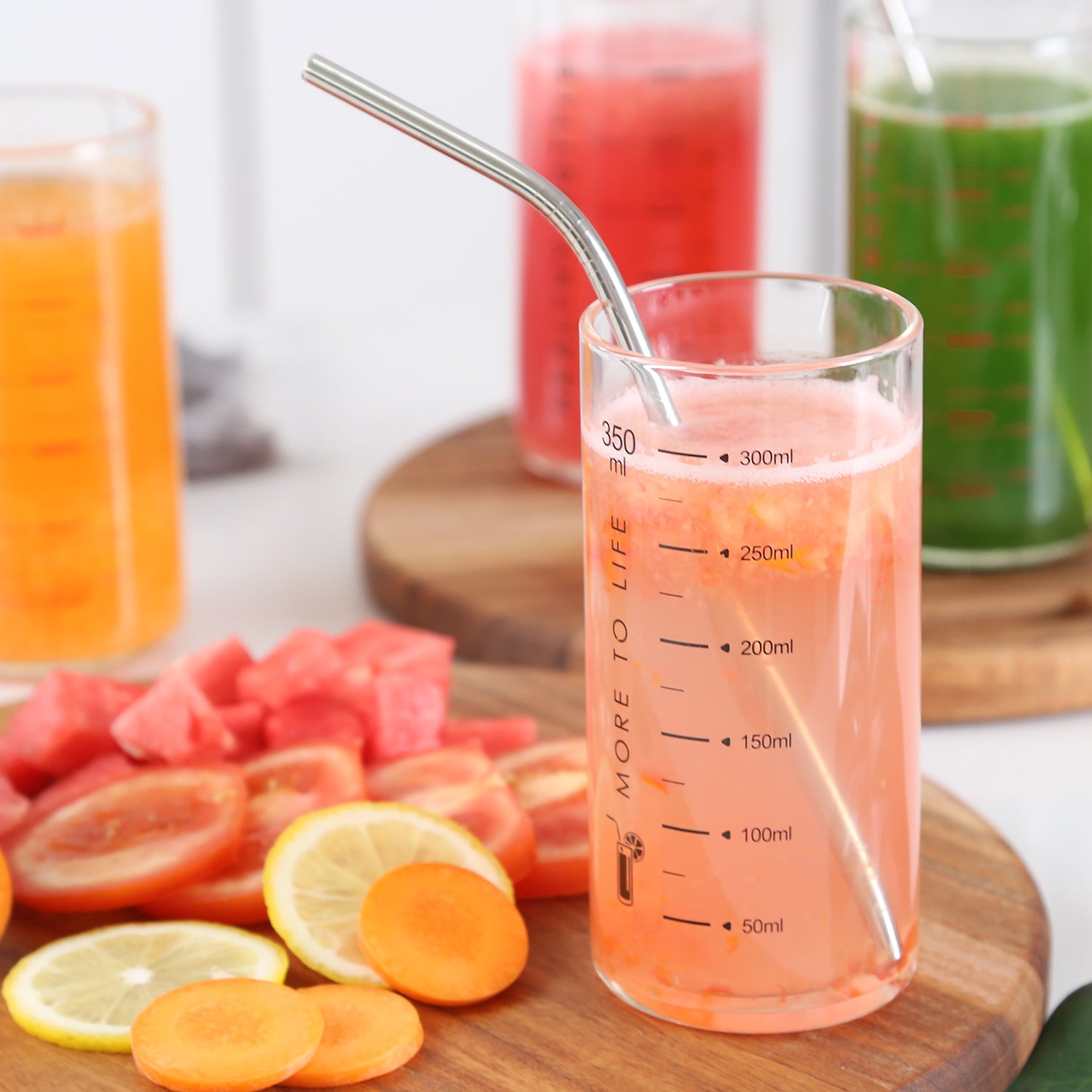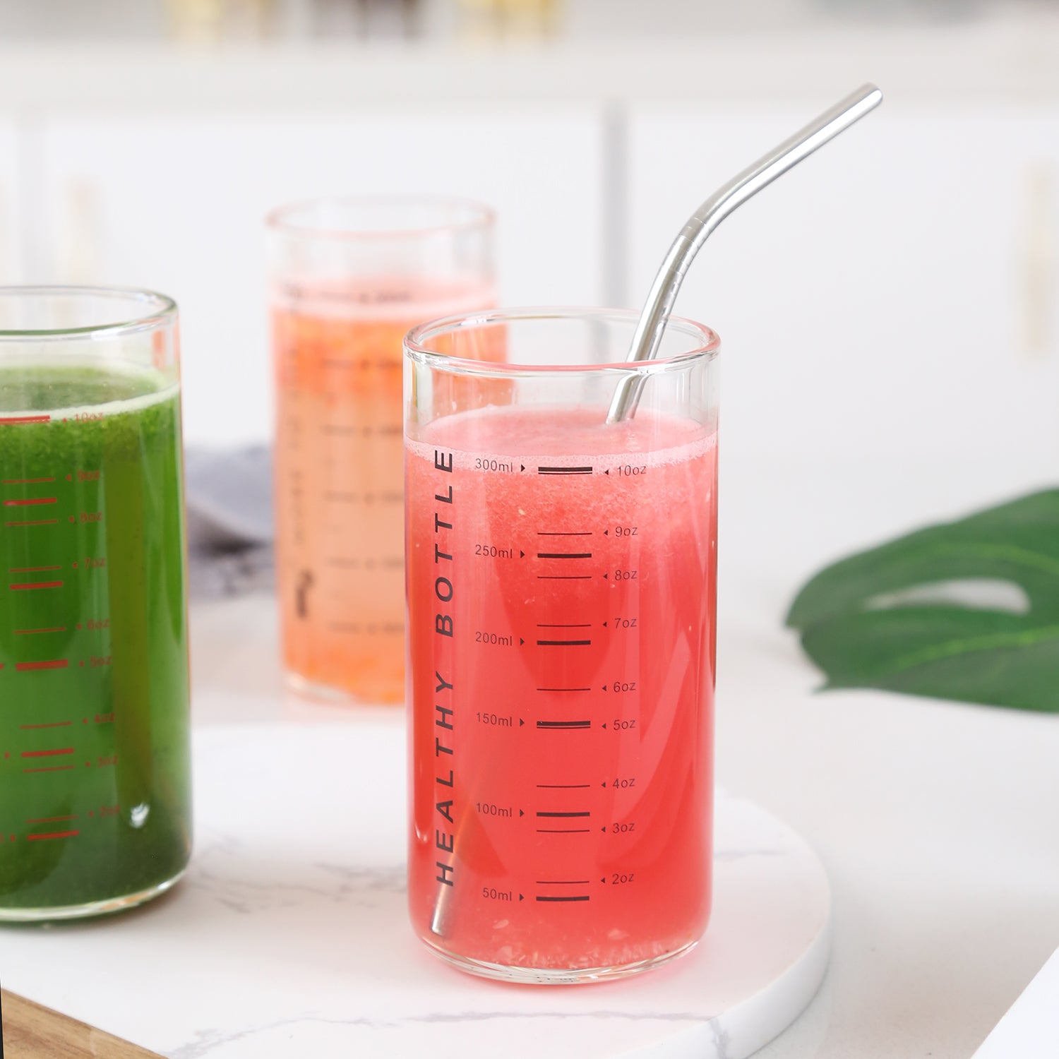 - 【Package Includes】2 x glass mearement cup, 2 × stainless steel straw, 2x brush to clean the straws.
